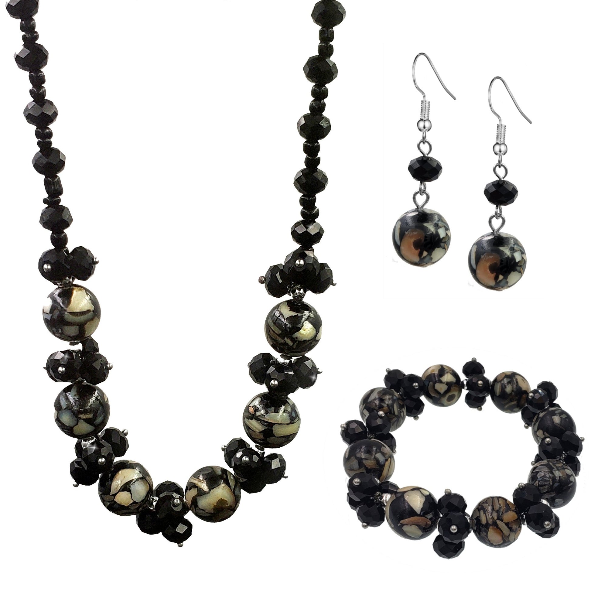Black Crystal Glass and Marble Necklace Earring Set