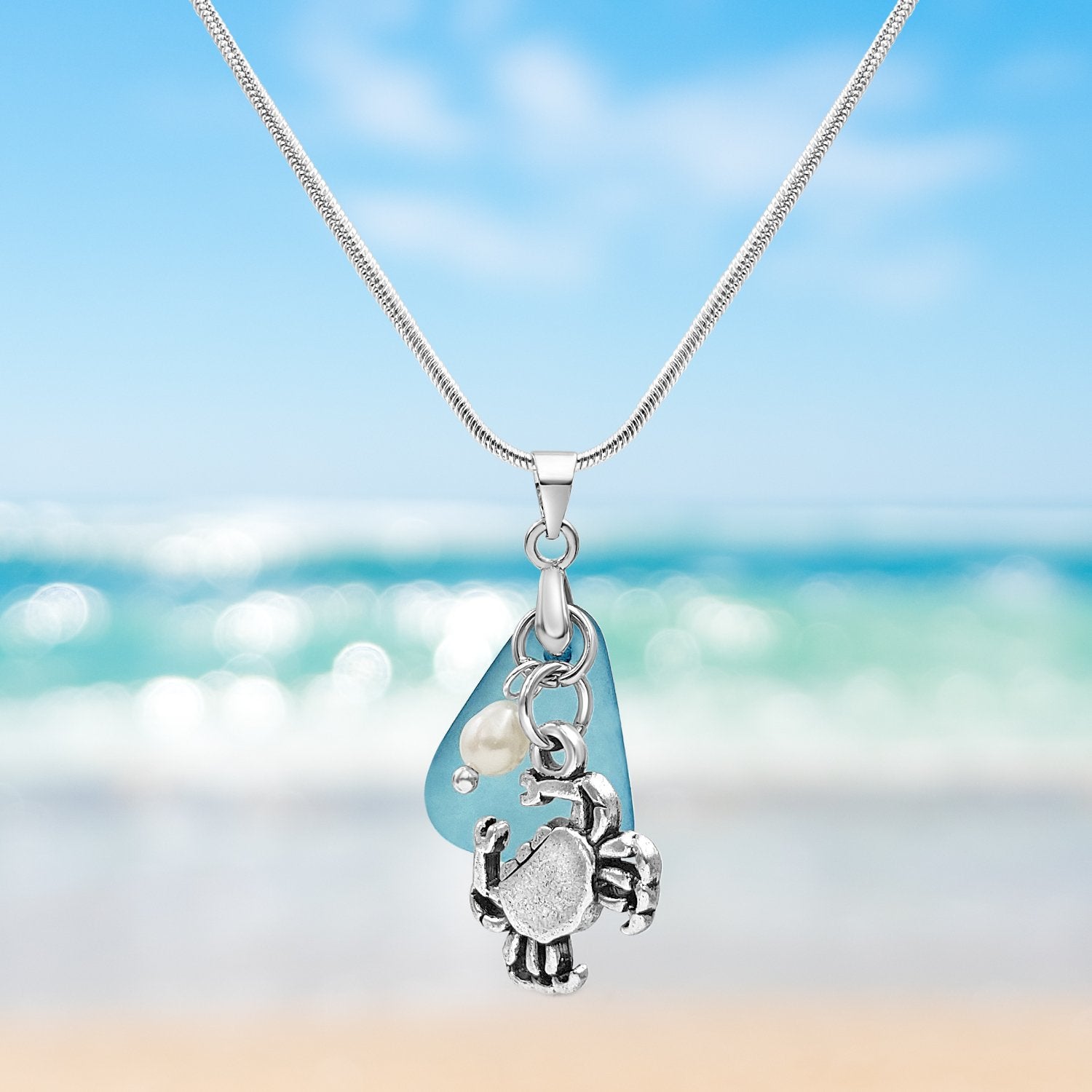 The combination of sea glass, pearl, and crab in this pendant necklace creates a stunning, one-of-a-kind piece. The warm, neutral tones of the sea glass, combined with the softness of the pearl and the texture of the crab make a perfect blend of earthy tones and texture. This necklace is a versatile accessory that can be worn casually or dressed up, making it the perfect addition to any wardrobe. The sea glass and pearl elements of the necklace will shimmer and shine in the light, while the crab adds texture and depth to the piece. The unique combination of materials creates a timeless look that will never go out of style.