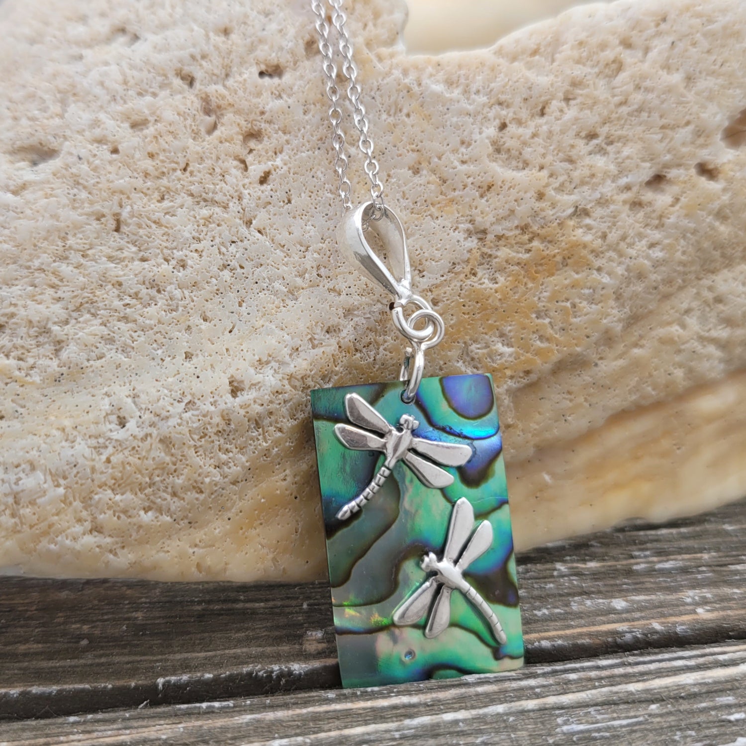 Sterling Silver and Paua Shell Dragonflies Rectangle Pendant Necklace | Handmade Hypoallergenic Boho Beach Gala Wedding Style Sterling Necklace Pendant