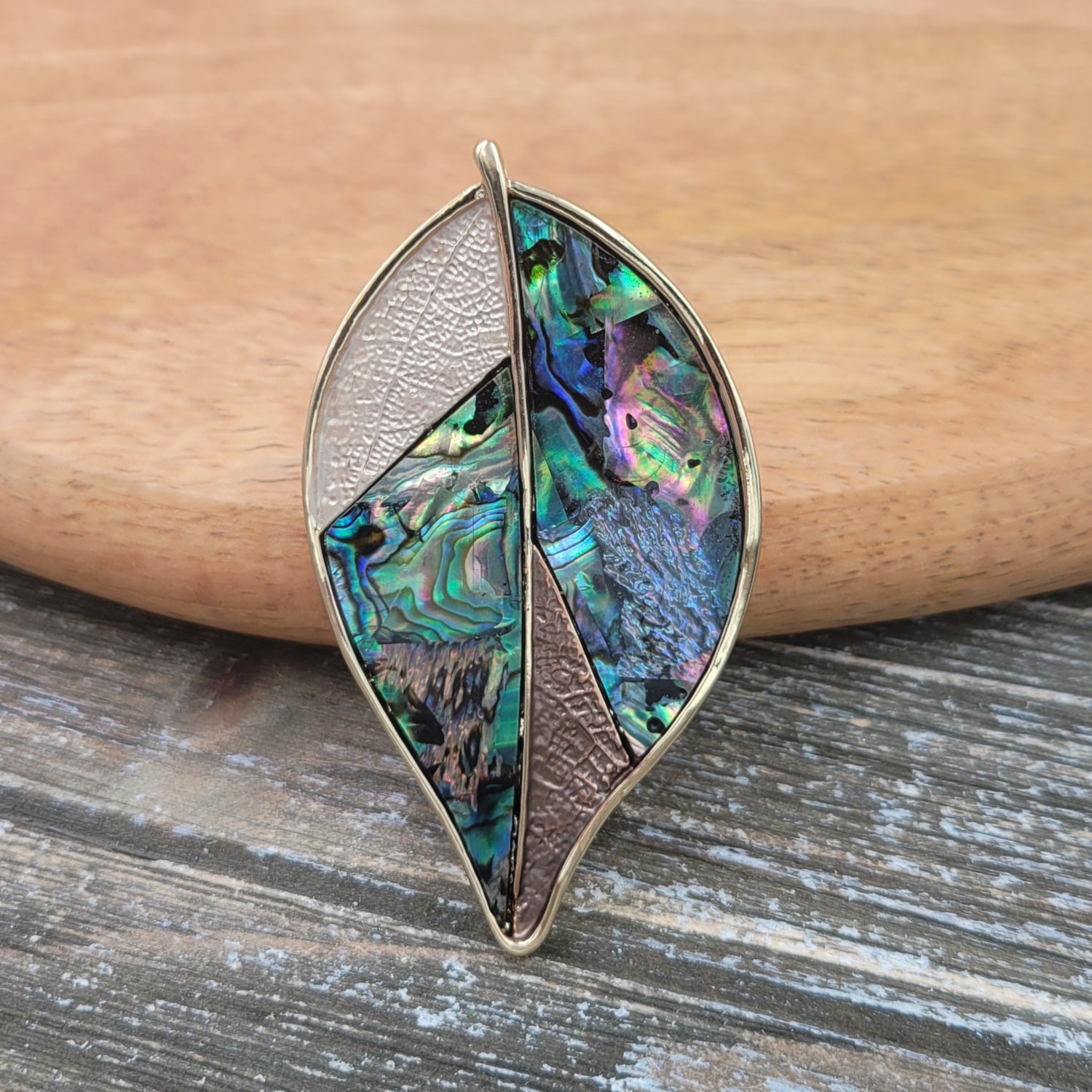 This beautiful brooch features a gorgeous leaf design crafted with abalone shell. It is made of high quality materials and has a lovely sparkling finish. The back of the brooch has a secure pin closure, making it perfect for wearing on your favorite jacket, blouse, or accessory. The design is classic and timeless and is sure to bring a touch of elegance to any outfit.