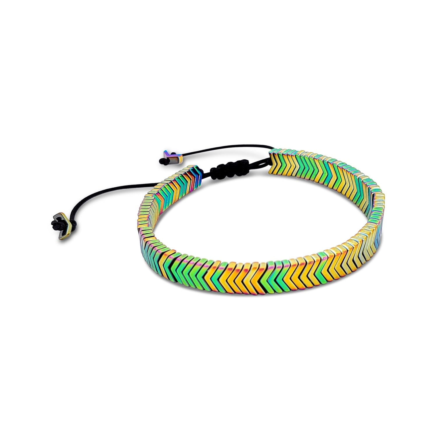 The rainbow hematite bracelet is the perfect accessory to add a touch of color and style to any outfit. It's great for adding a pop of color to your favorite girly skirts, shorts, denim and dresses. Not only is it fashionable, but it's also beneficial - the rainbow hematite beads are associated with The Master Grounding Stone, helping to dissolve low energy vibrations and ease stress and anxiety. Plus, it's made of high-quality, woven cotton thread with a unique, chic pattern. Add a touch of sparkle, color and protection to your favorite looks with this beautiful bracelet.