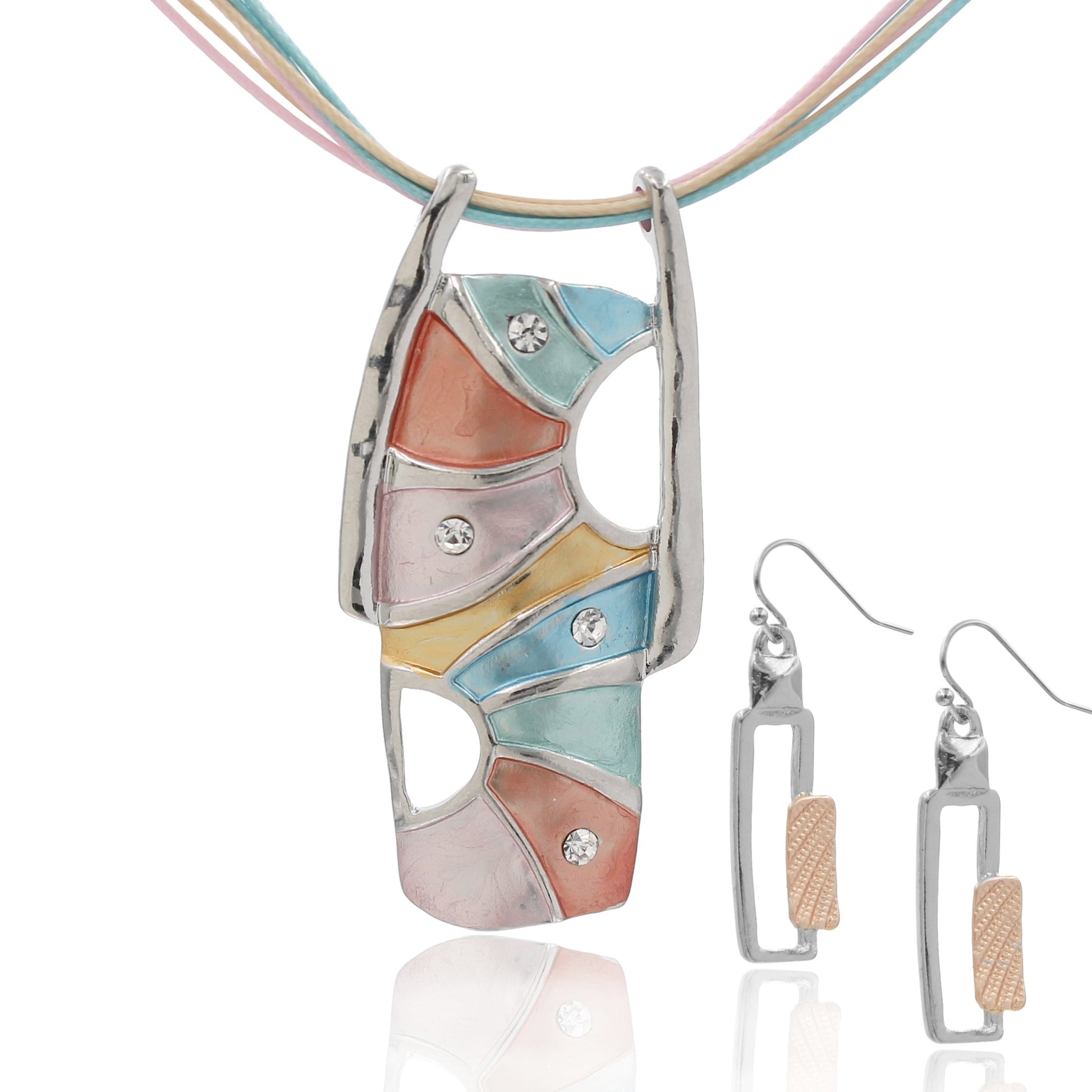 This stunning necklace and earring set features a classic art deco design, with an geometric pattern and sparkling accents. The intricate details of the metalwork create a timeless look that will never go out of style. The pieces are crafted from high-quality materials, making sure you can enjoy them for many years to come. The necklace and the earrings feature vibrant color that add a touch of sparkle. This set is perfect for dressing up any outfit or adding a touch of glamour to any occasion.