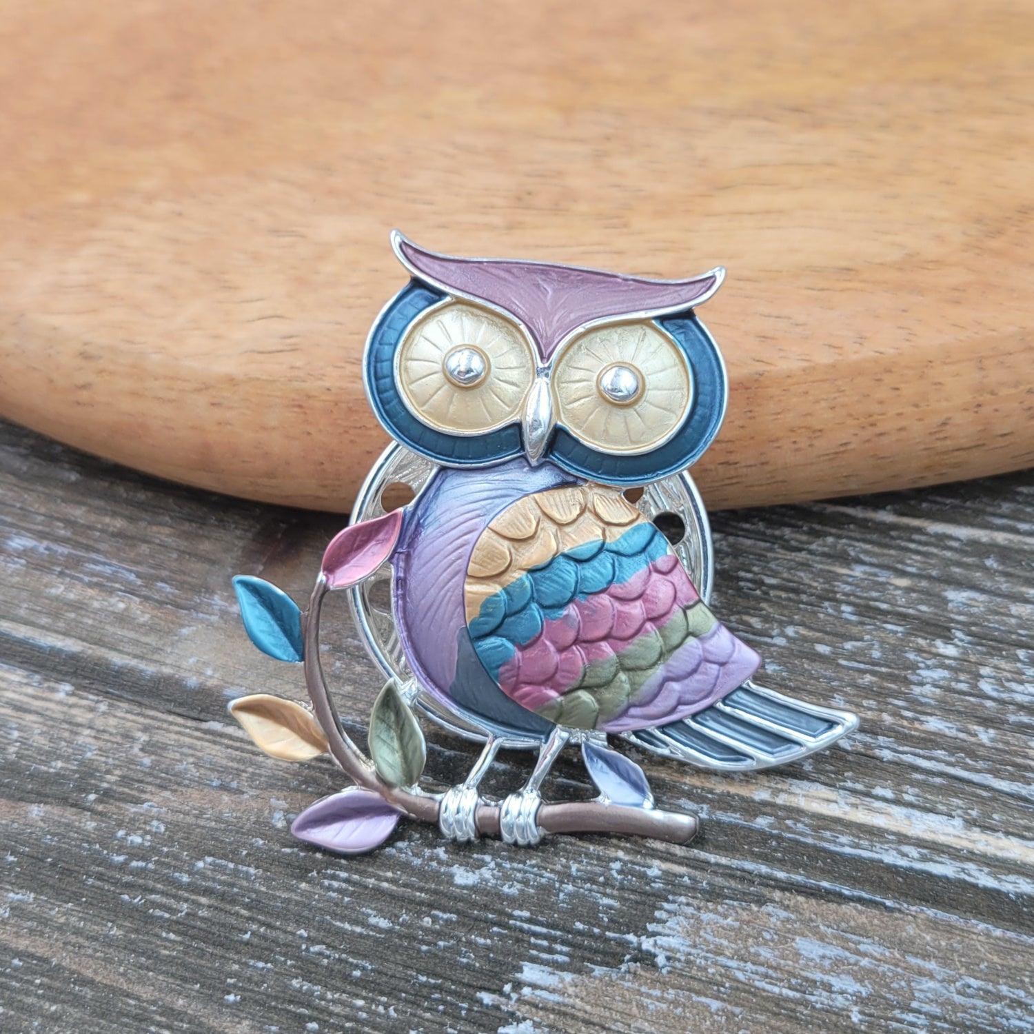 BESHEEK Silvertone Rainbow Owl Magnetic Professional Artisan Brooch Pin | Handmade Hypoallergenic Office, Suit, Networking Style Jewelry