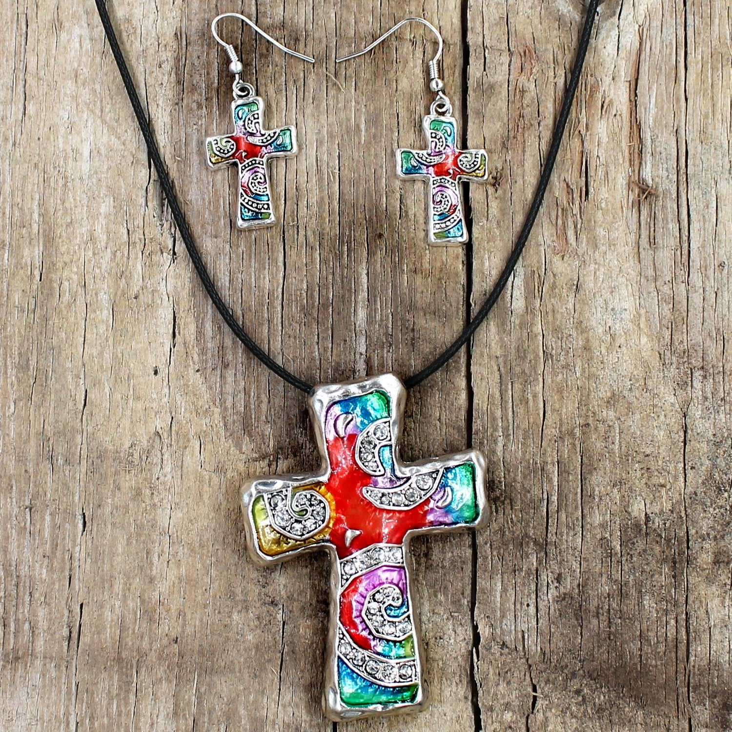 Silvertone Rainbow Mosaic Cross Necklace and Earring Set