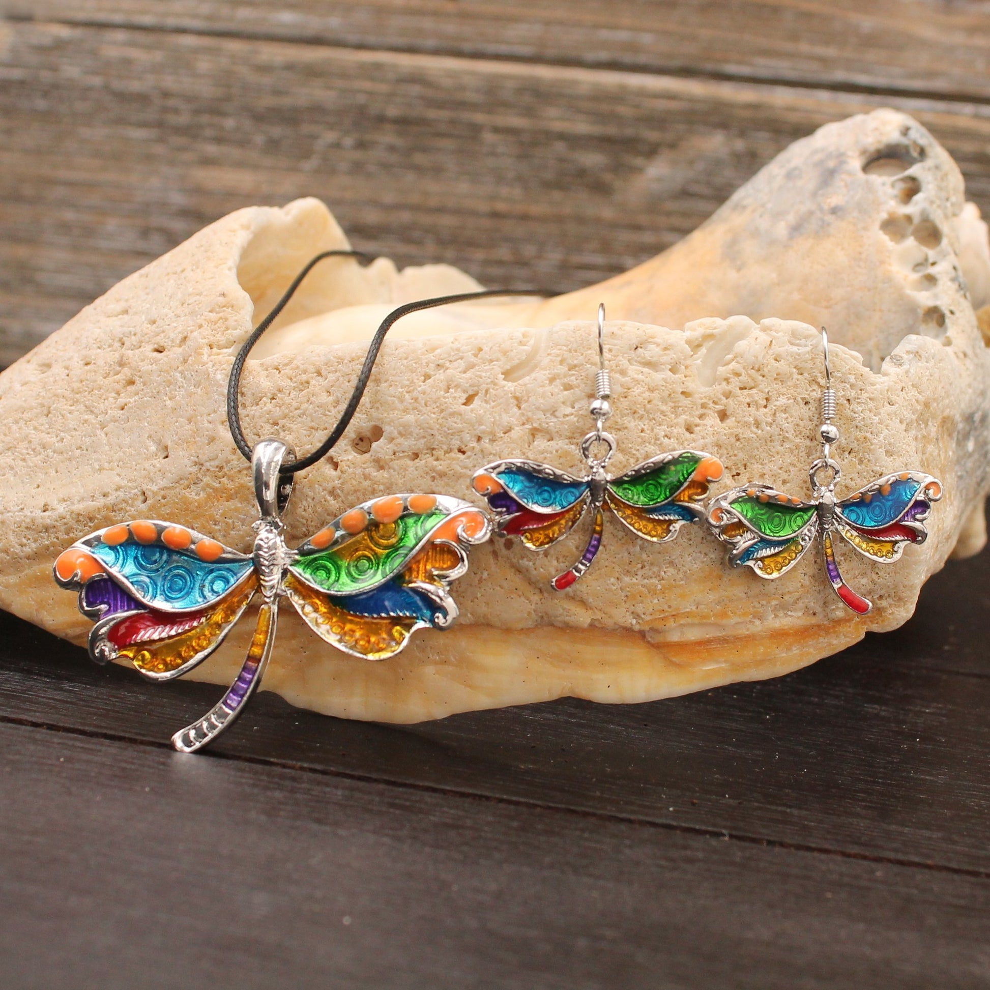 Silvertone Rainbow Mosaic Dragonfly Necklace and Earring Set