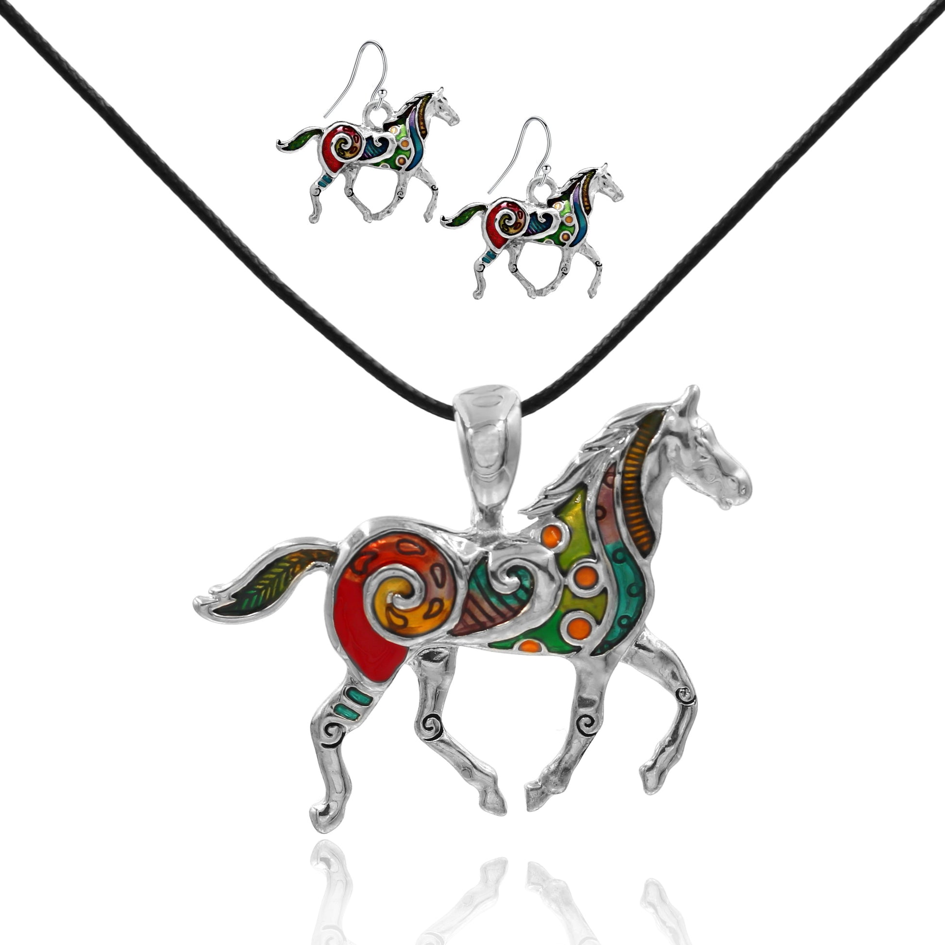 Silvertone Rainbow Mosaic Horse Necklace and Earring Set