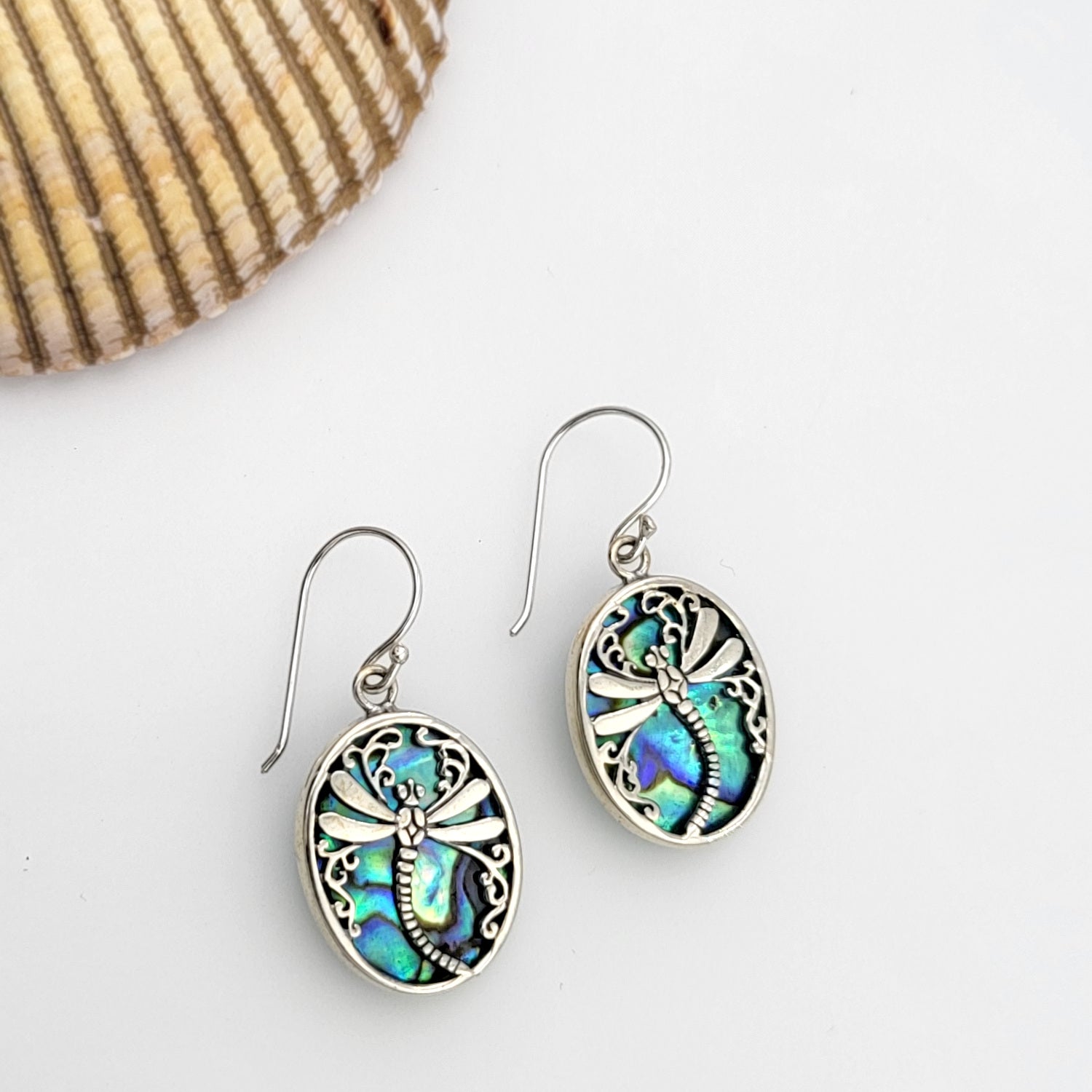 Sterling Silver and Abalone Dragonfly Oval Dangle Earrings | Handmade Hypoallergenic Boho Beach Gala Wedding Style Sterling Earrings